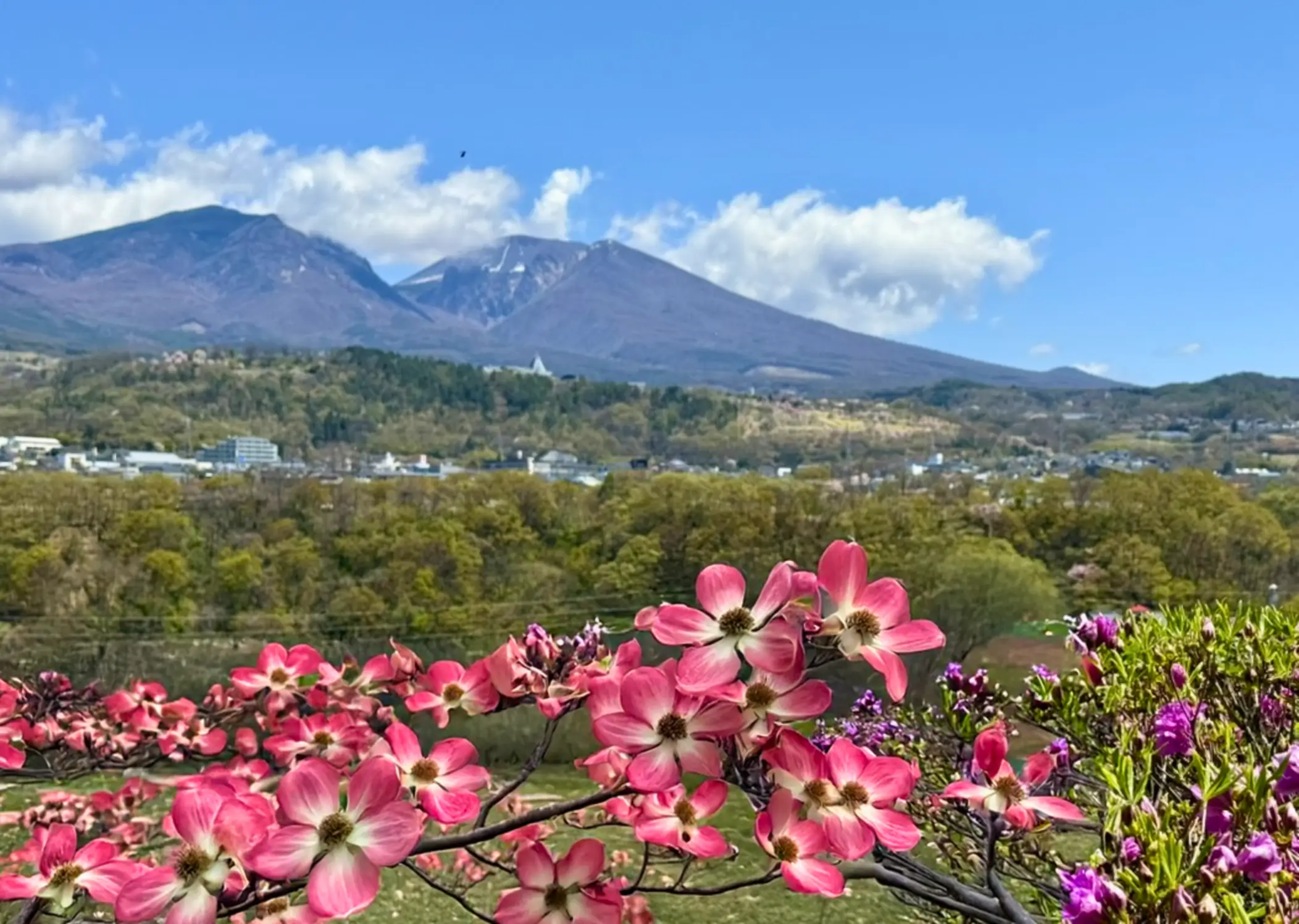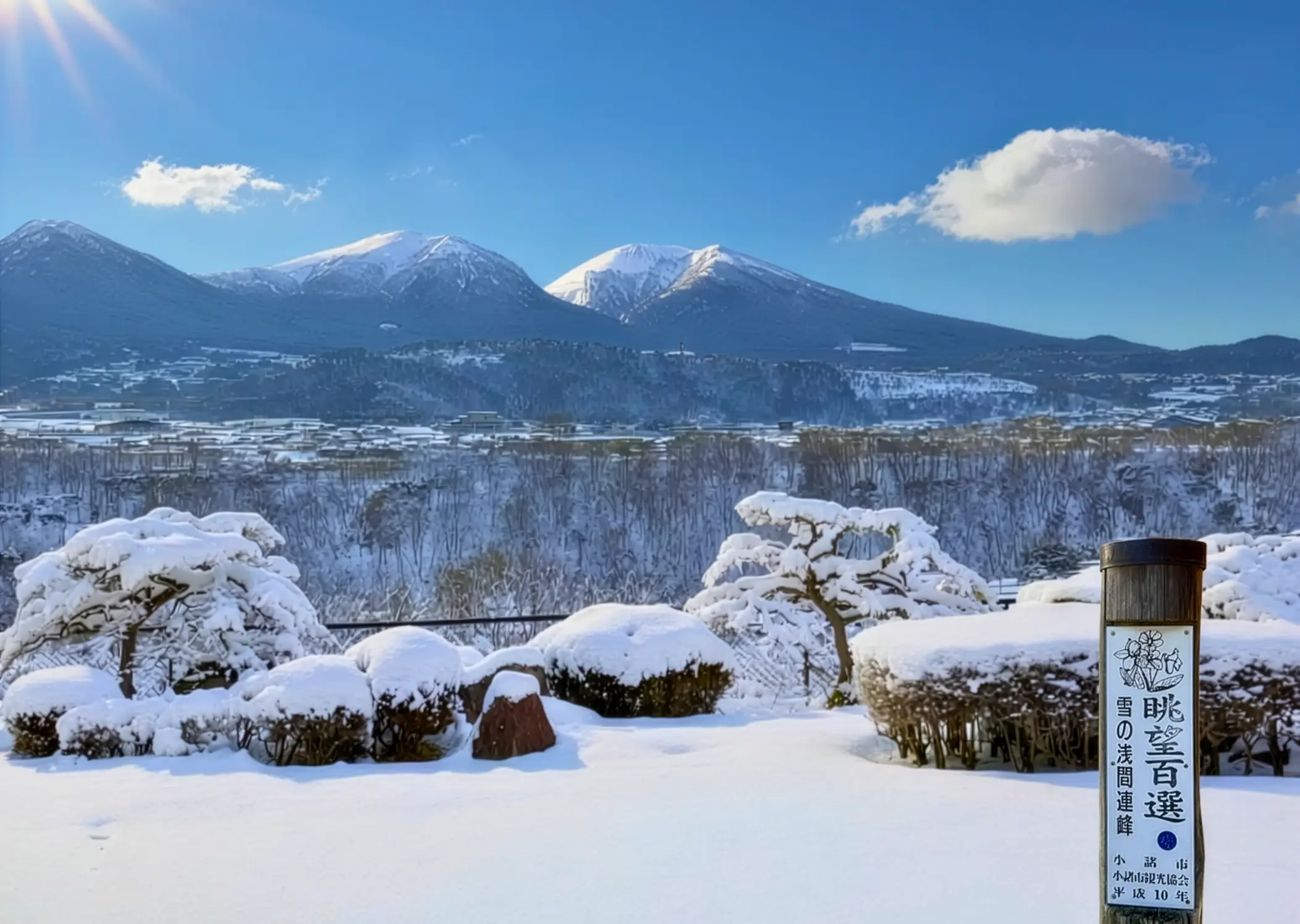 湯けむりの向こうに広がる、信州の山々と静寂の風景。