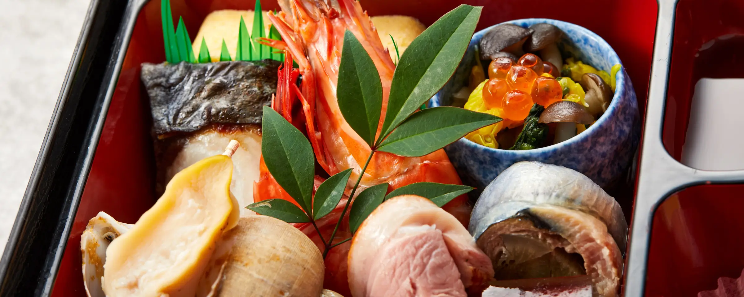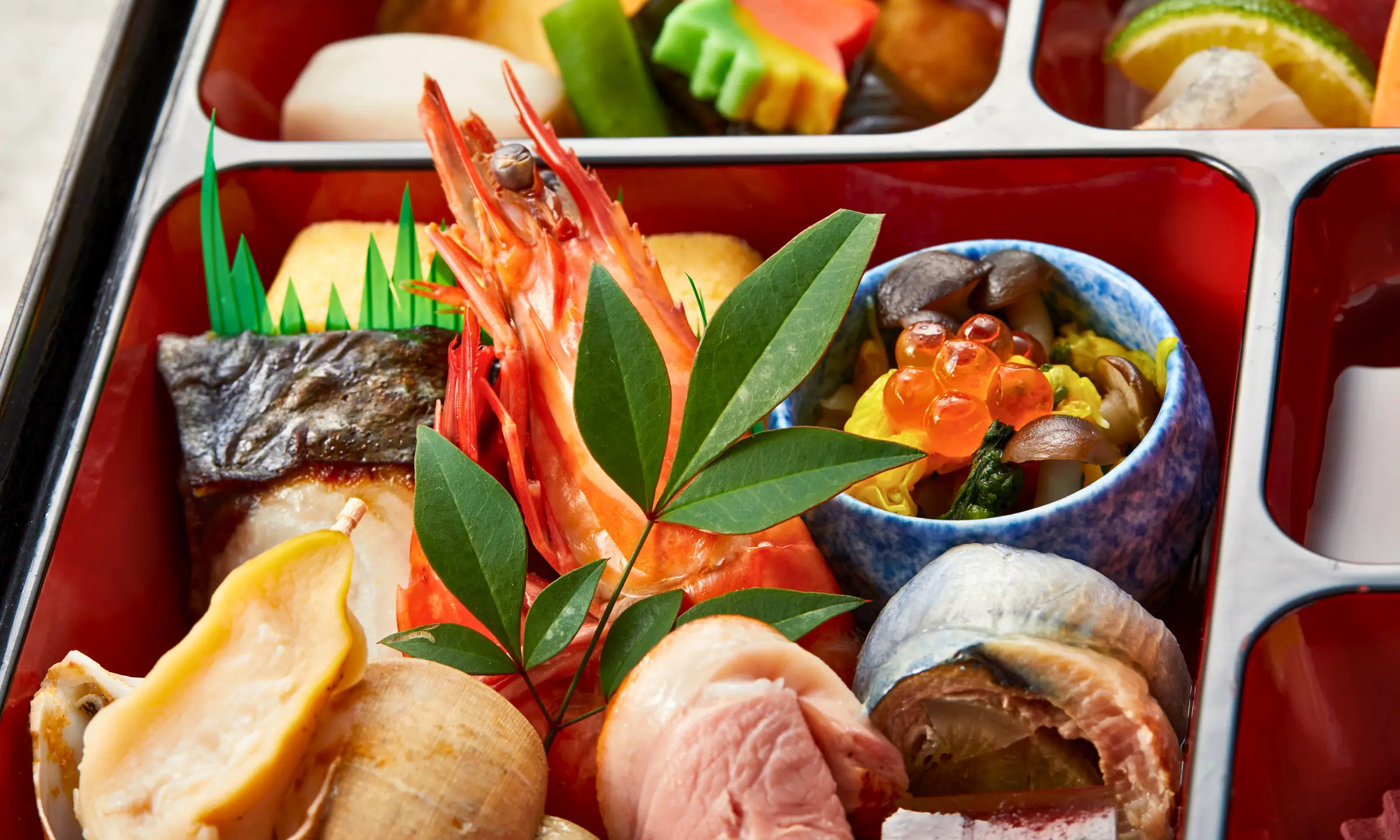 菊花拌菜/日式玉子燒/西京燒鰆魚/海老旨煮/梅貝甘露煮/秋刀魚八幡卷/烤鴨胸/羊羹/菊花蕪