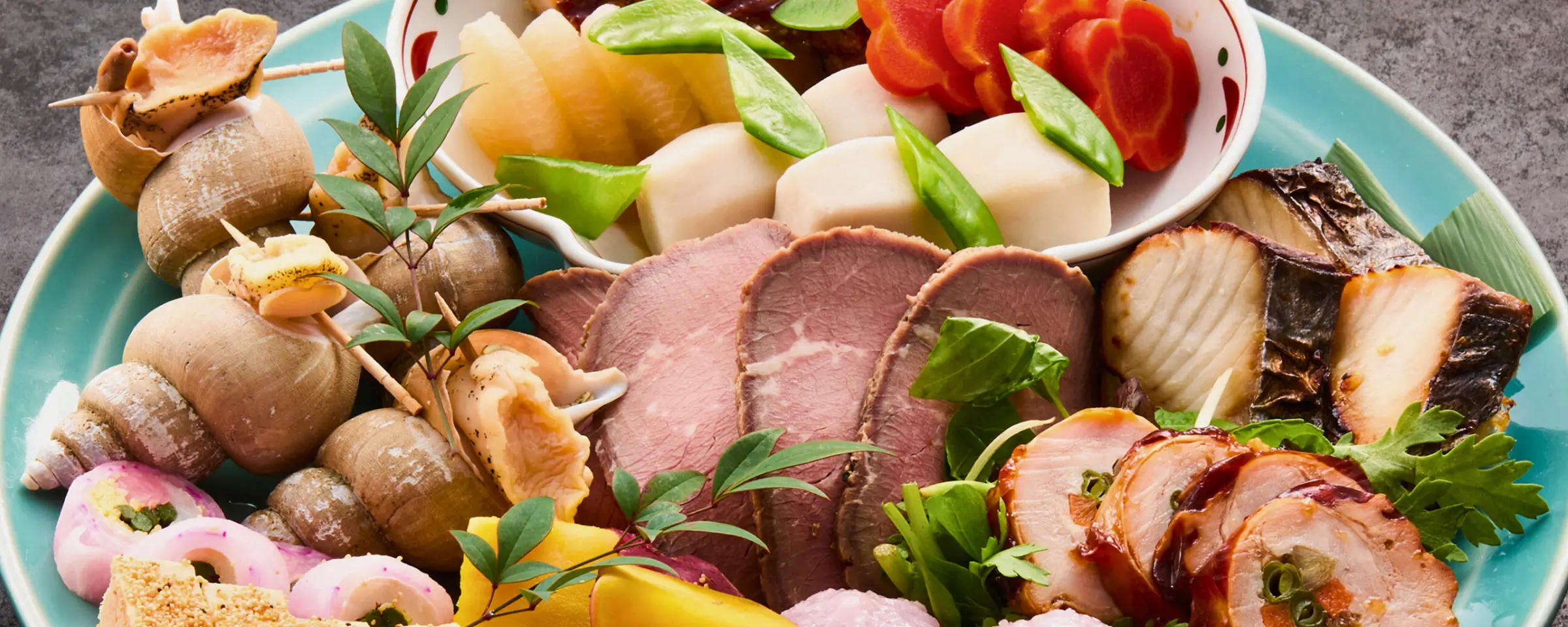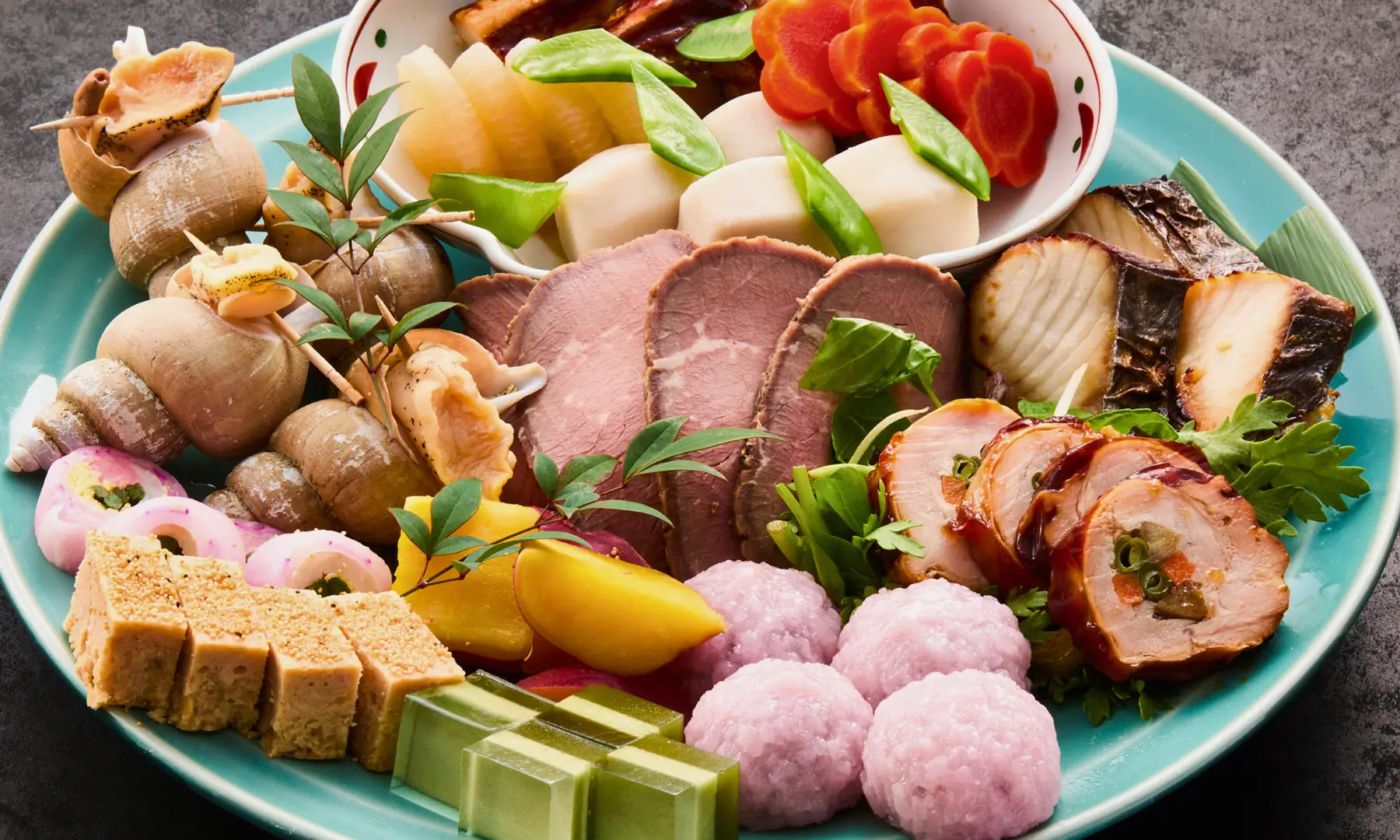 梅貝甘露煮/西京燒鰆魚/雞肉捲/松風燒/砧卷/烤牛肉/綜合燉煮料理/甜點